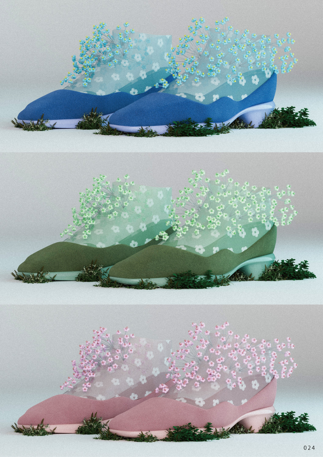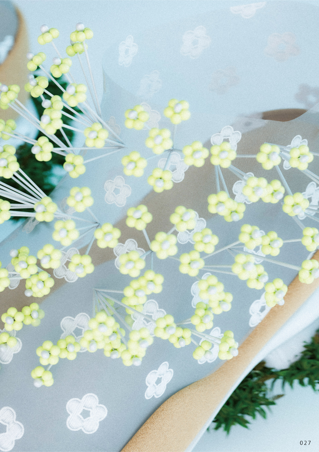 小花はガラスビーズで作製し、不均一さもそのままに手作業で立体的に刺繍を施している。不完全でアンバランスな花々や名もなき草を足元にあしらい、履いた瞬間に遠い記憶の原風景の一部となる。春の草原を歩いているようなこの作品は、自然を外から眺めるのではなく、溶け込むような視点で表現されている。人間もまた、自然の一部なのである。