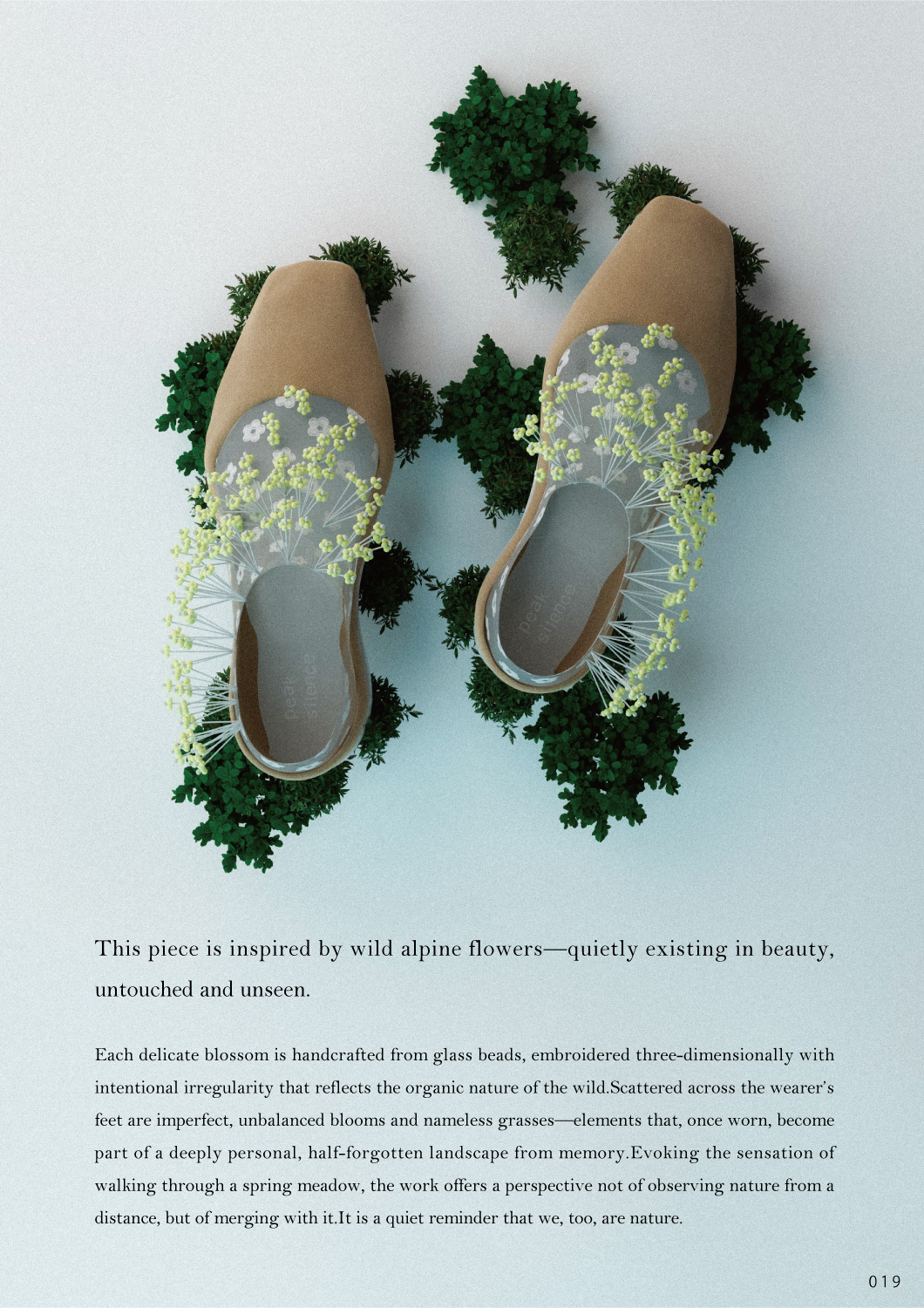 Each delicate blossom is handcrafted from glass beads, embroidered three-dimensionally with intentional irregularity that reflects the organic nature of the wild.Scattered across the wearer’s feet are imperfect, unbalanced blooms and nameless grasses—elements that, once worn, become part of a deeply personal, half-forgotten landscape from memory.Evoking the sensation of walking through a spring meadow, the work offers a perspective not of observing nature from a distance, but of merging with it.It is a quiet reminder that we, too, are nature.